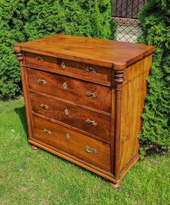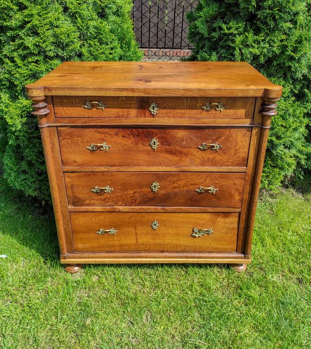 Niezwykle pojemna i klasyczna komoda typu biedermeier, łączy w sobie elegancję i ponadczasowy styl. Wyróżnia się dużą ilością miejsca do przechowywania. Cztery szuflady, w tym trzy duże i jedna mniejsza, dają dużą przestrzeń na przechowywanie rzeczy.