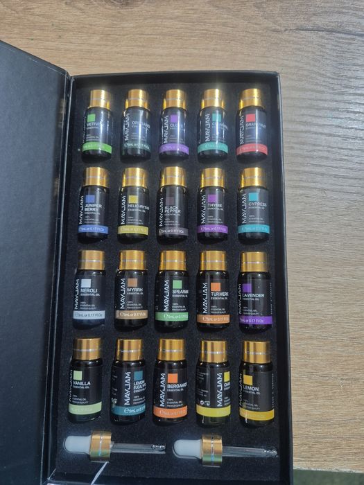 Zestaw 20 butelek olejków eterycznych premium quality marki Mayjam. Każda butelka zawiera 5 ml czystego, naturalnego olejku. Idealne na prezent lub do własnego użytku.