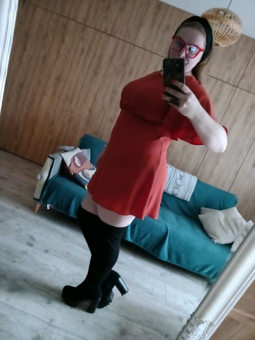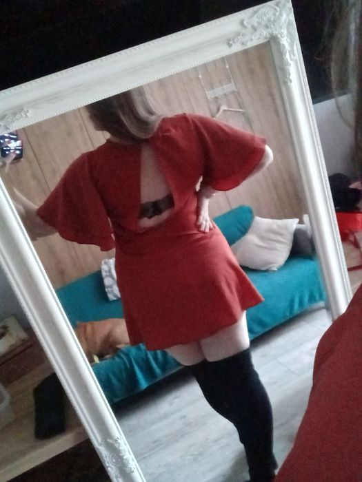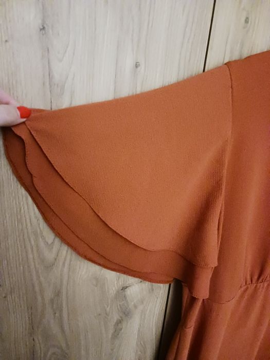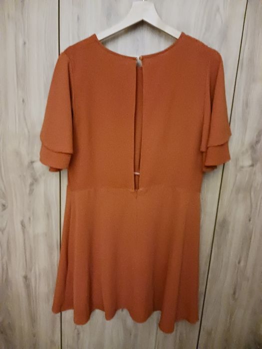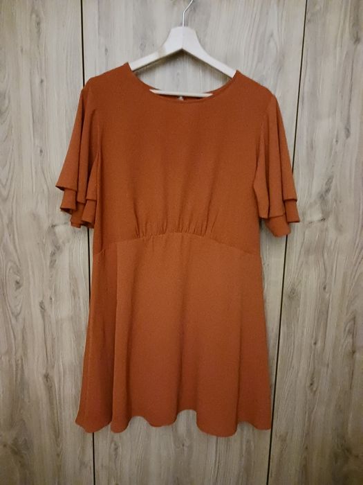 Mini sukienka New Look rozmiar 46. Szerokie rękawy, głębokie wycięcie na plecach, od biustu rozkloszowana w dół. Materiał rozciąga się 2-3 cm. Pachy 120 cm, talia 100 cm, biodra 126 cm, długość 85 cm. Kolor ceglany.