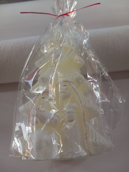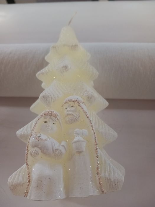 Świeczka w kształcie choinki z figurkami Świętej Rodziny. Wykonana z białego wosku, ozdobiona delikatnymi złotymi akcentami. Świeczka w nowym stanie, gotowa do użycia.