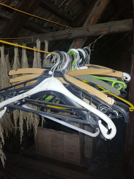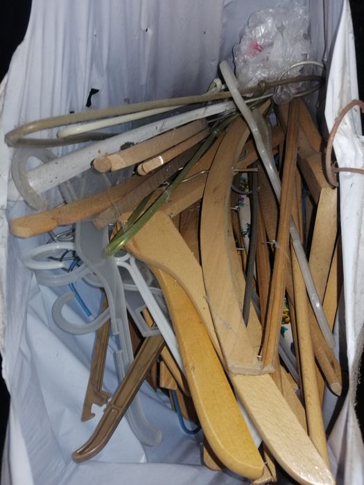 Zestaw starych, drewnianych wieszaków na ubrania oraz innych wieszaków w różnych kolorach. Przedmioty są używane, ale w dobrym stanie. Mogą być przydatne do przechowywania i organizacji garderoby.