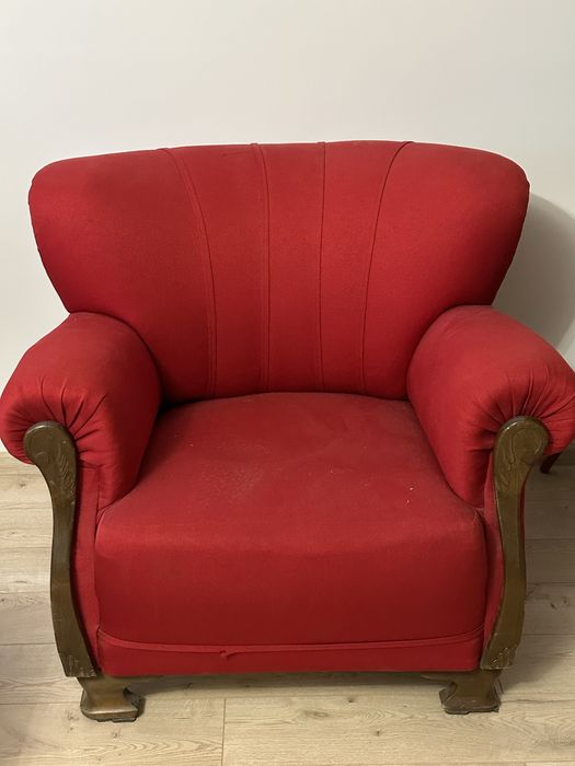 Czerwony fotel z drewnianymi elementami