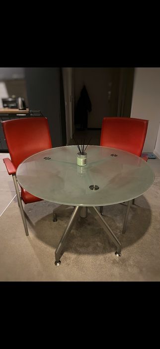 Modernistyczny komplet 2 foteli z szklanym stolikiem.