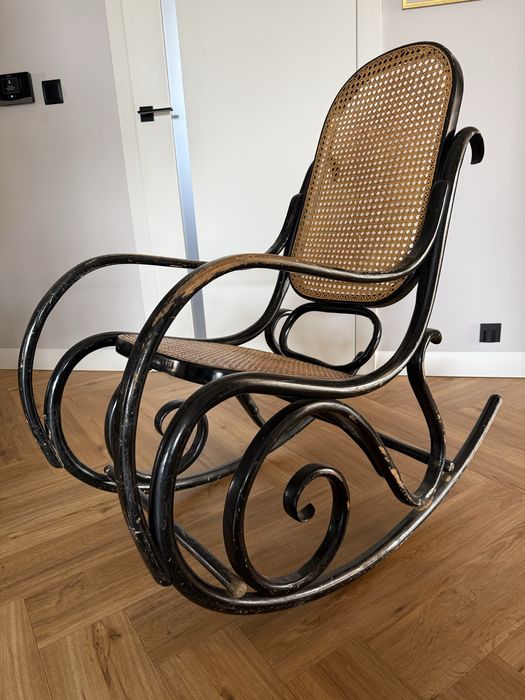 Fotel bujany drewniany czarny z siedzenie i oparcie z plecionki wiedeń