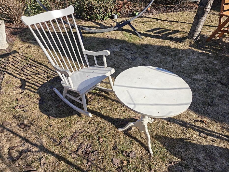 Biały fotel bujany Windsor i stolik drewniany zestaw