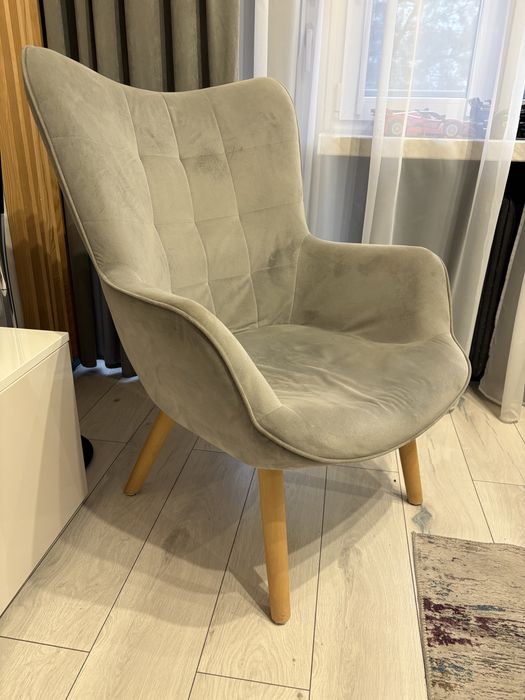 Fotel welurowa tkanina, nogi drewniane