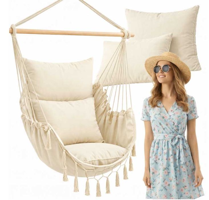 FOTEL WISZĄCY Krzesło Brazylijskie Ogrodowy bujany zestaw biuro BOHO hamak BEŻOWY