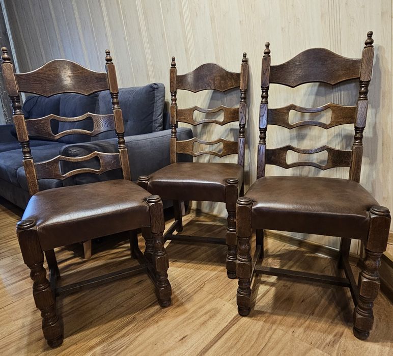 3 solidne drewniane krzesła, skórzane obicie