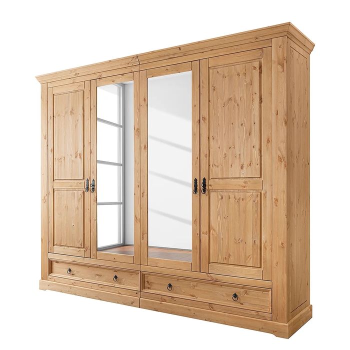 Duża drewniana szafa sosnowa 4-drzwiowa z lustrem i szufladami