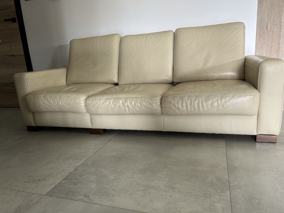 Sprzedam wypoczynek z naturalnej skóry écru z drewnianymi wstawkami