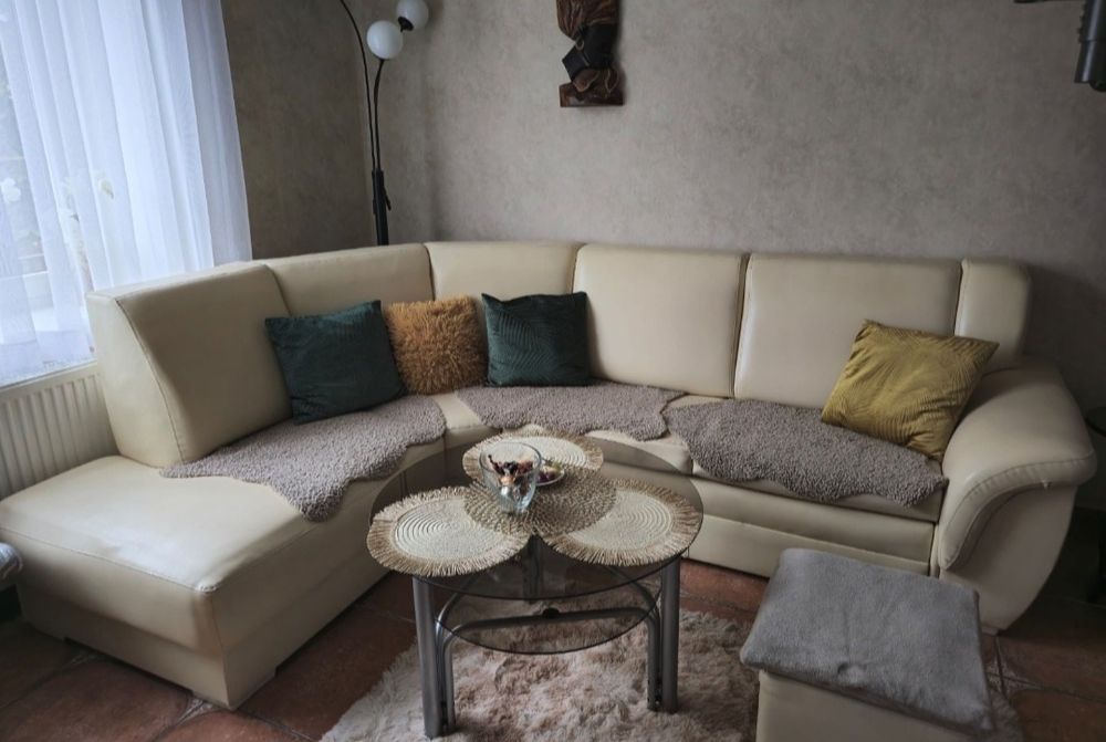 Jasna kanapa narożna z fotelem