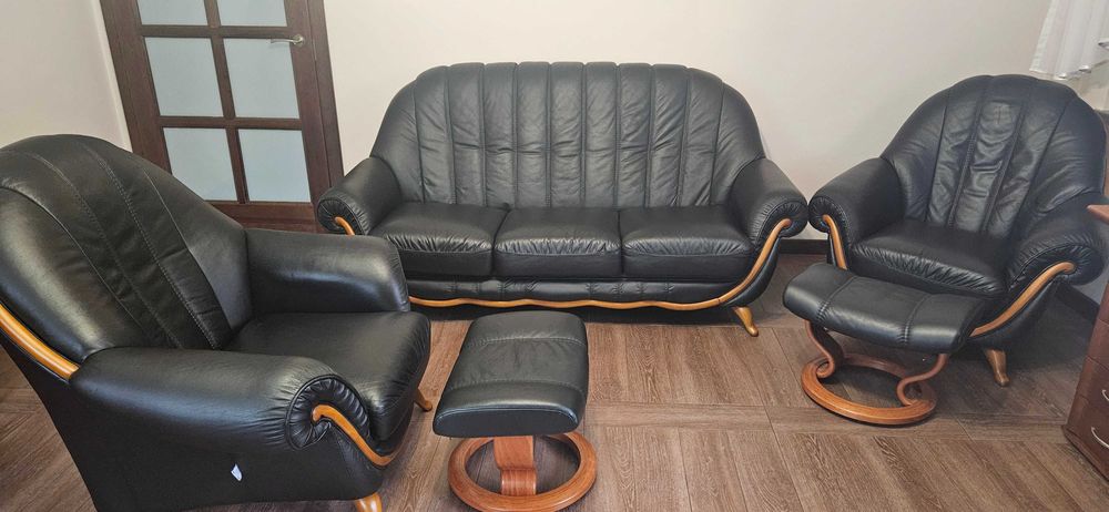 Skórzany komplet wypoczynkowy 3+1+1 + 2 podnóżki