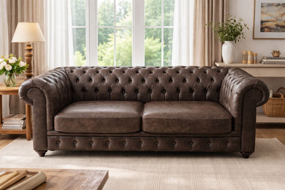Pikowana Sofa Skórzana na nóżkach z Metalowymi kułeczkami