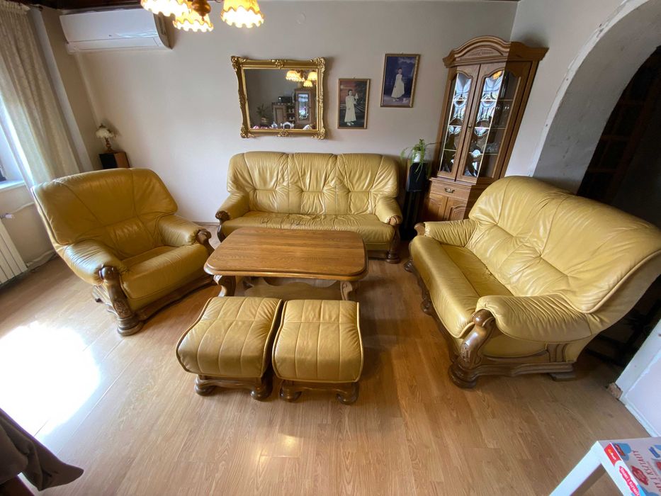 Skórzany komplet wypoczynkowy + witryna dębowa + ława
