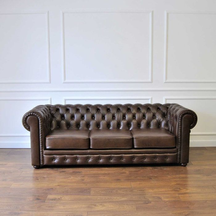 Pikowana sofa chesterfield skórzana 3-osobowa skóra naturalna plisy