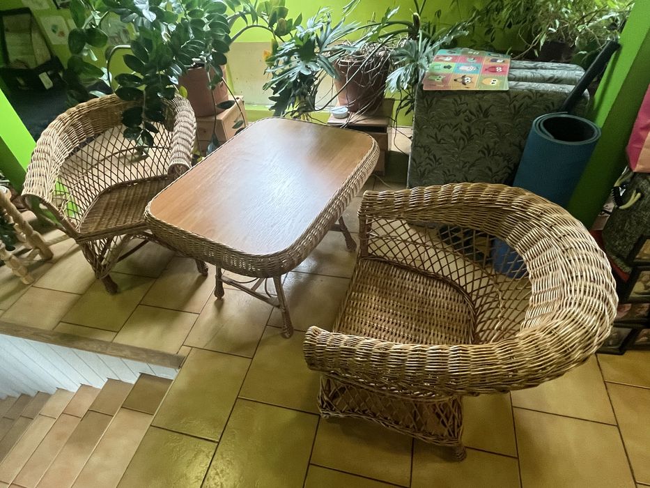 Zestaw wiklinowy: stolik i dwa fotele