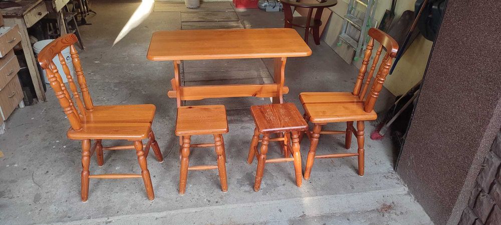Stół drewniany, dwa krzesła, dwa taborety