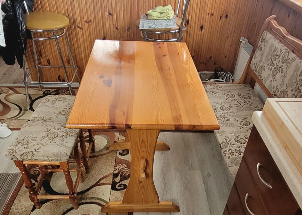 Stół drewniany z taboretami i ławeczką