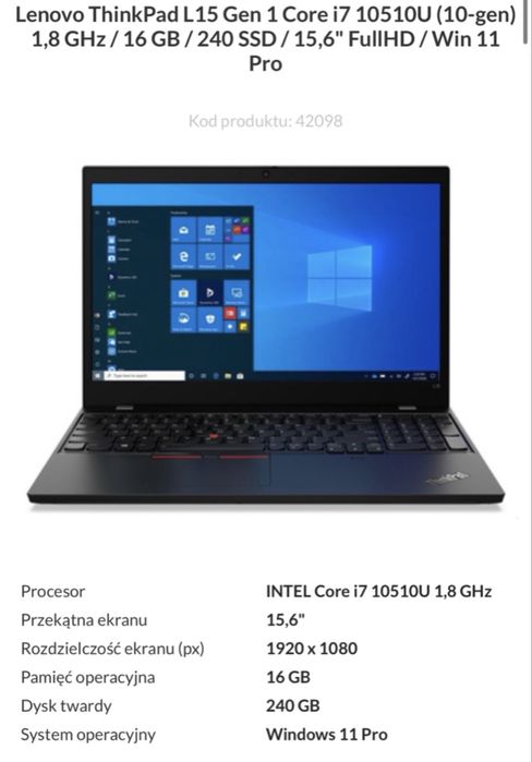 Lenovo thinkpad L15 Gen 1 i7, 16GB RAM 240GB SSD-Stan dobry