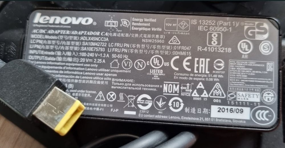 Oryg smukły zasilacz ładowarka lenovo 3.25A 20V 65W prostokątny wtyk