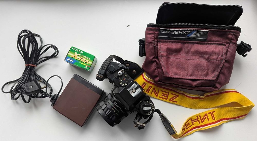 Aparat Zenit 122 + Helios 44M-4 58mm f/2 + lampa + futerał