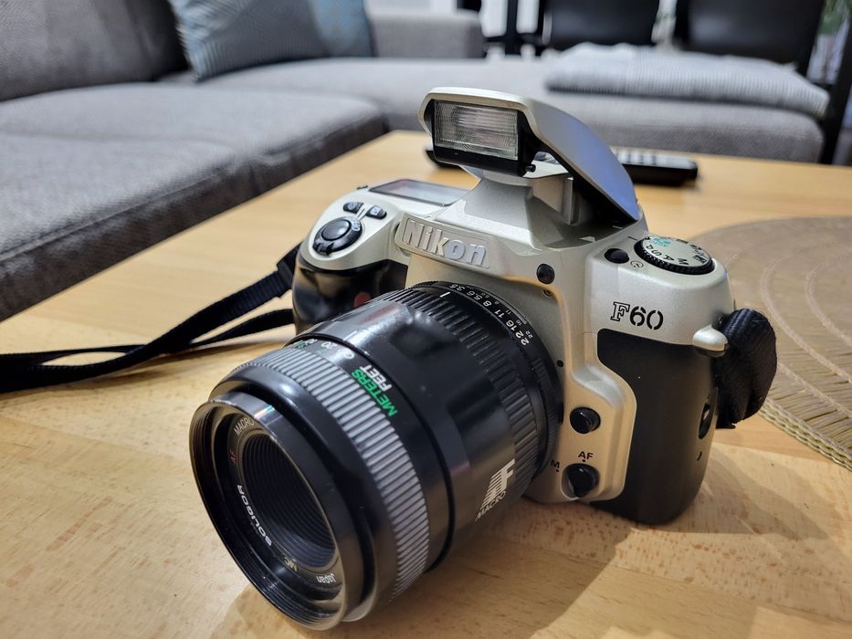 Aparat, Nikon F60,Obiektyw Soligor Macro, 100mm, 1:3.5, fi 49mm Jap