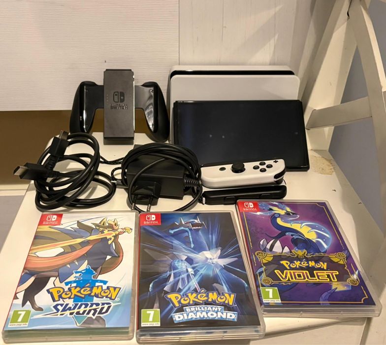 Nintendo Switch OLED biały + 3 gry Pokemon - stan bardzo dobry