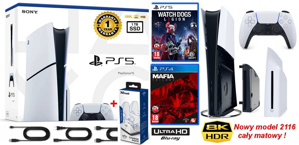 PS5 Slim 1TB + 4 gry + Dualsense + stacja ładowania + model 2116 + ROK