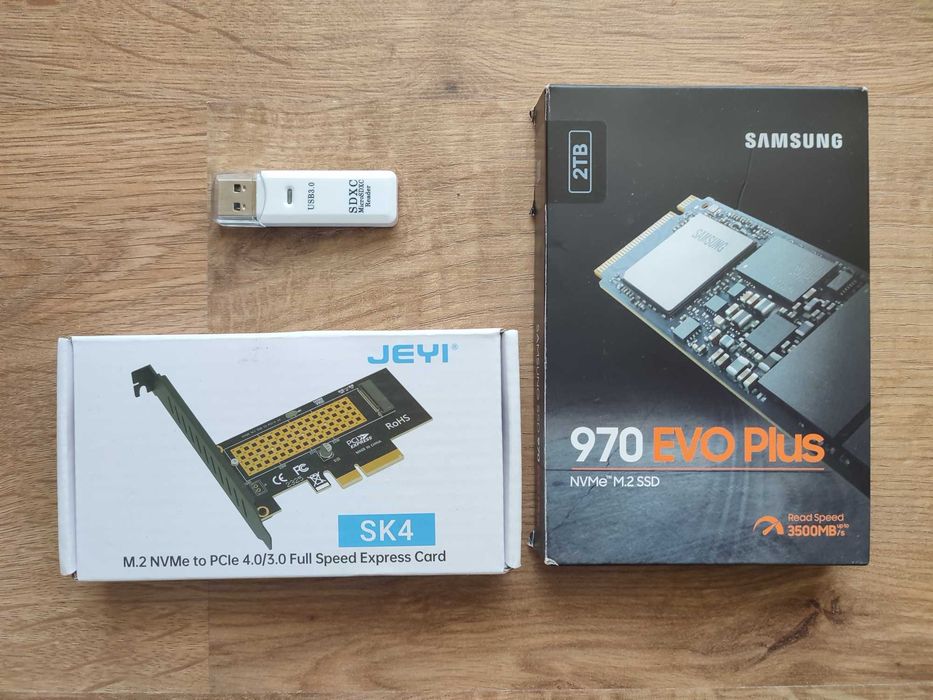 Czytnik SD (USB 3.0), adapter PCIe, dysk SSD Samsung 970 EVO Plus 2TB