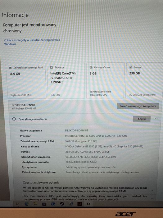 Sprzedam komputer HP PRODESK 16/256GB G5  i5 - 9500 + zasilacz