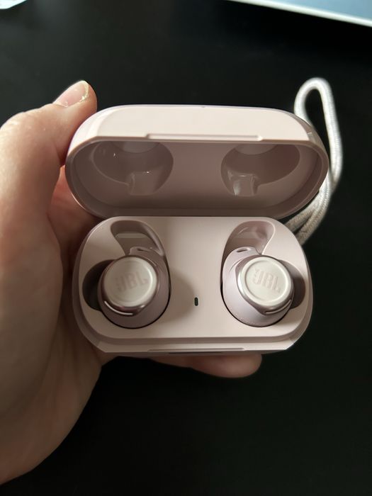 Słuchawki bezprzewodowe JBL różowe z mikrofonem.