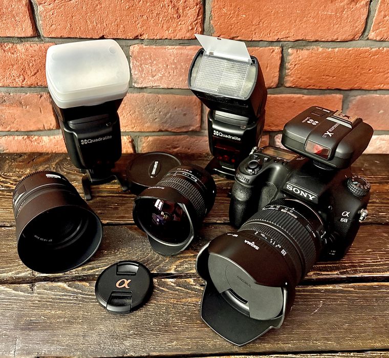 Aparat Sony A68, 3 obiektywy, 2 lampy ze sterownikiem i plecak.