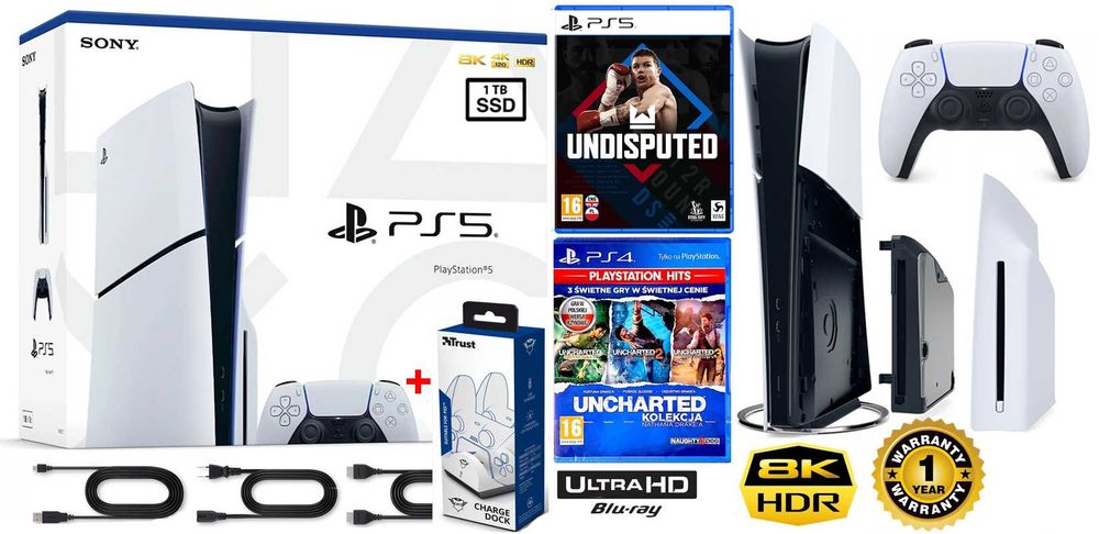 PS5 Slim 1TB 2016 + 4 gry + pad Dualsense + stacja ładowania + ROK GW