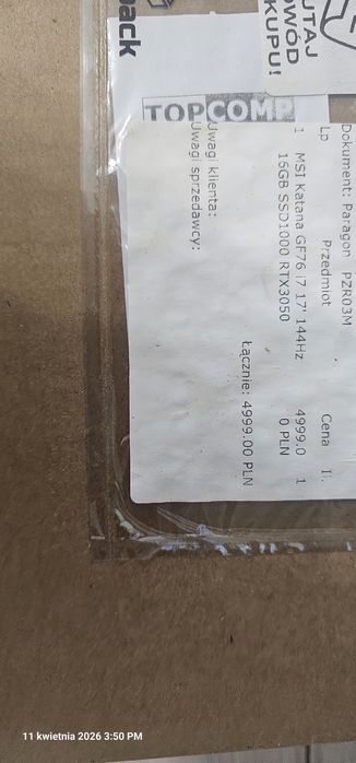 Laptop MSI Katana GF76 i7 11800h 16gb ram 1tb ssd, gtx 3050 4gb + mysz Logitech G502X PLUS