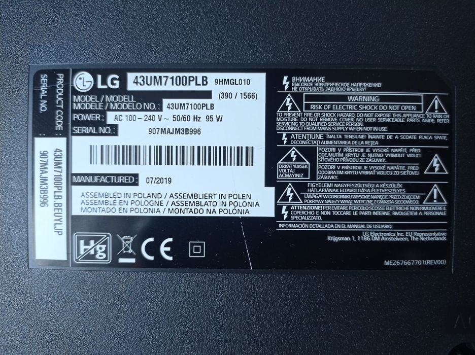 Telewizor LG 43UM7100PLB uszkodzona matryca