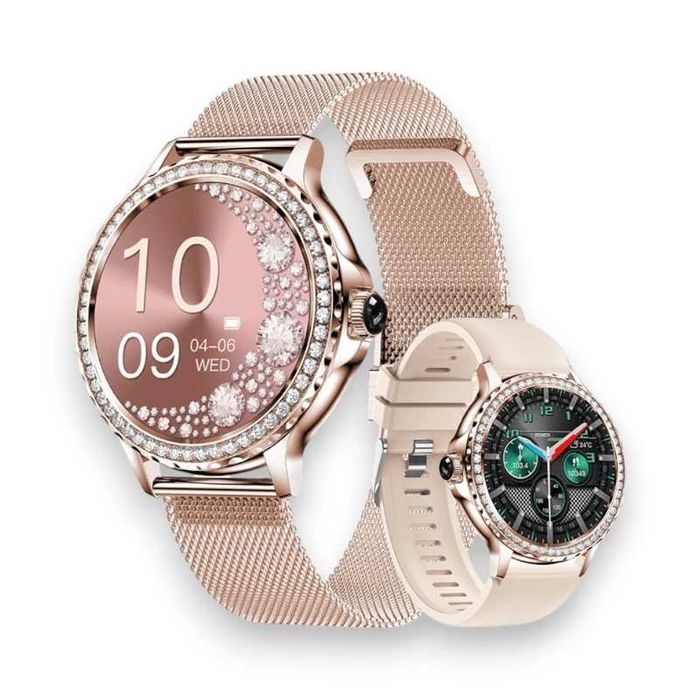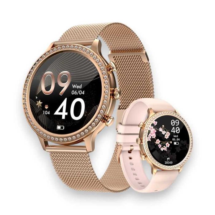 Złoty Zegarek Smartwatch Damski Rozmowy Ciśnienie Pulsometr Sen Kroki