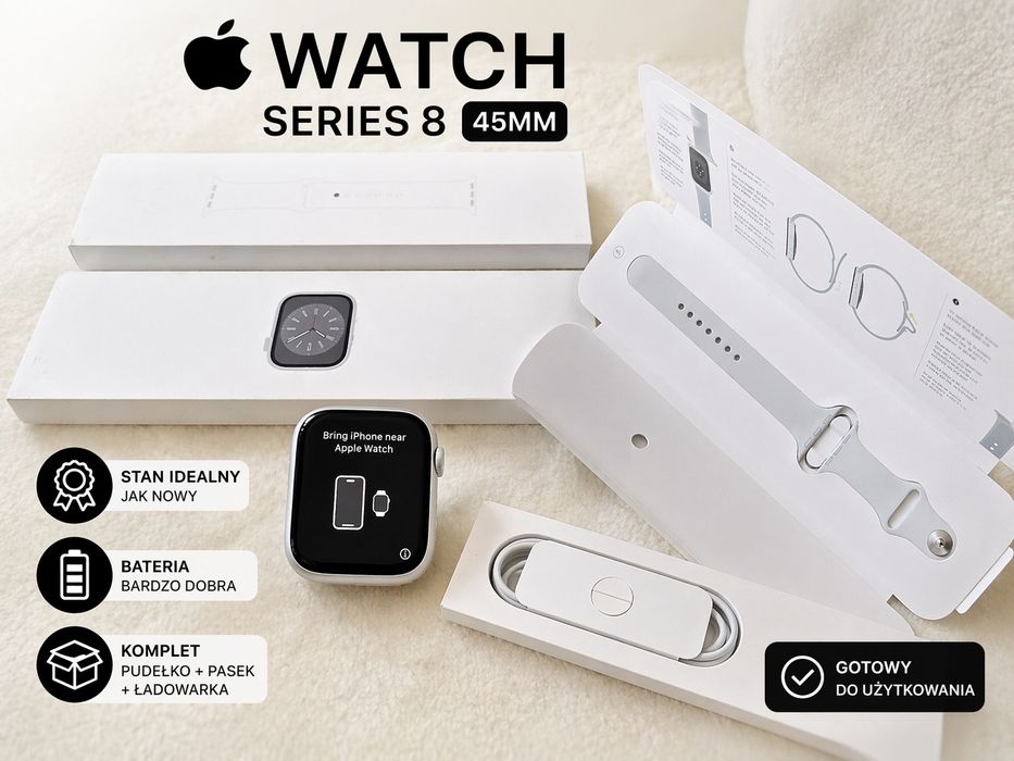 Apple Watch Series 8 45mm Silver Aluminium White Sport Band stan idealny