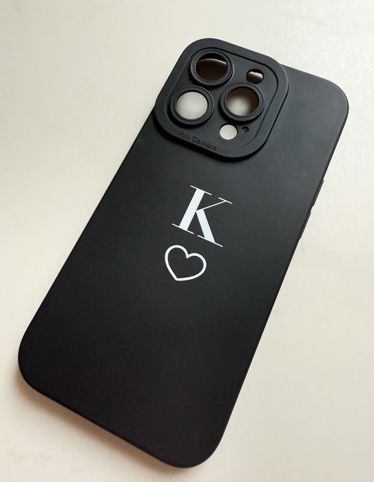 Gumowe czarne etui na iPhone 14 Pro z literką K i sercem serce