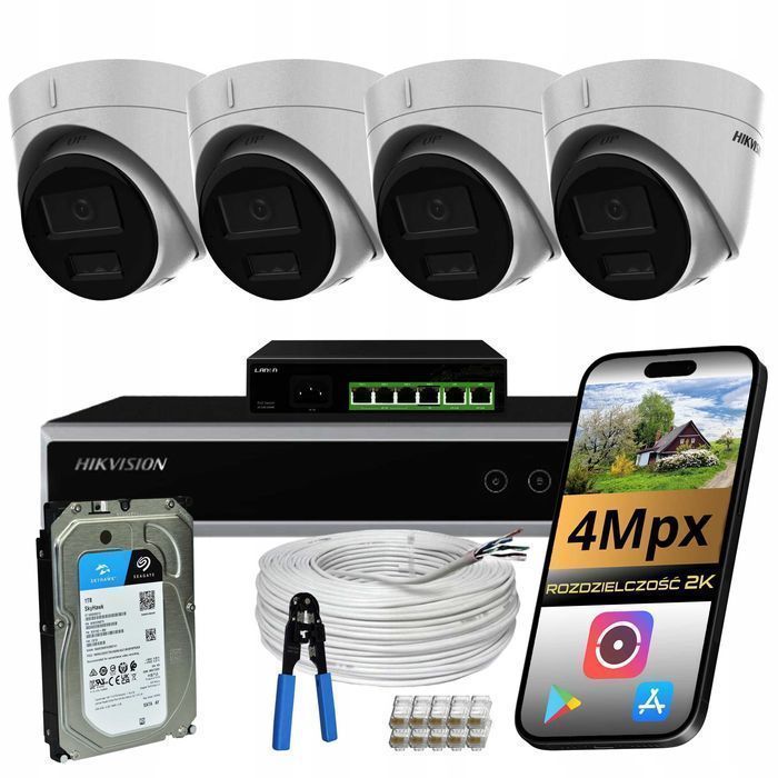 Zestaw monitoring Hikvision 4 kamery mikrofon LED AI dysk 1TB dom plac