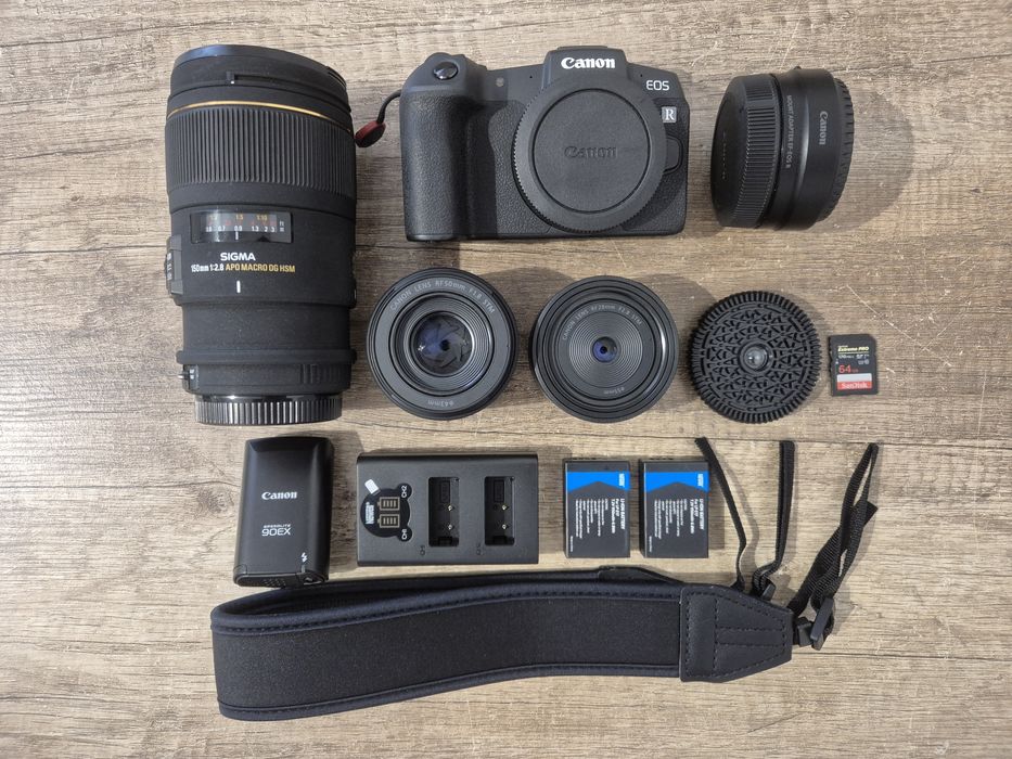 Zestaw Canon: Rp + RF28 + RF50 + Sigma 150 2,8 + adapter RF + dodatki