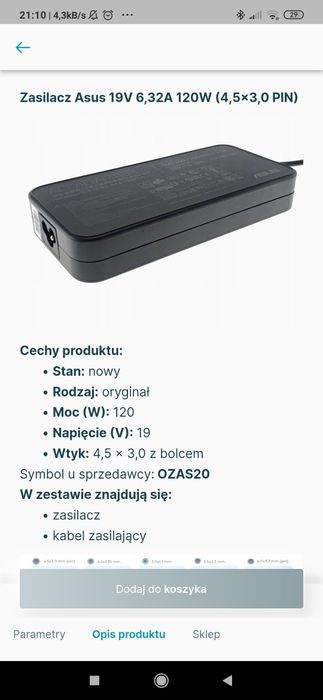 Zasilacz Ładowarka 19v 2.37a (4.0x1.35) - Asus, Vivobook, Zenbook