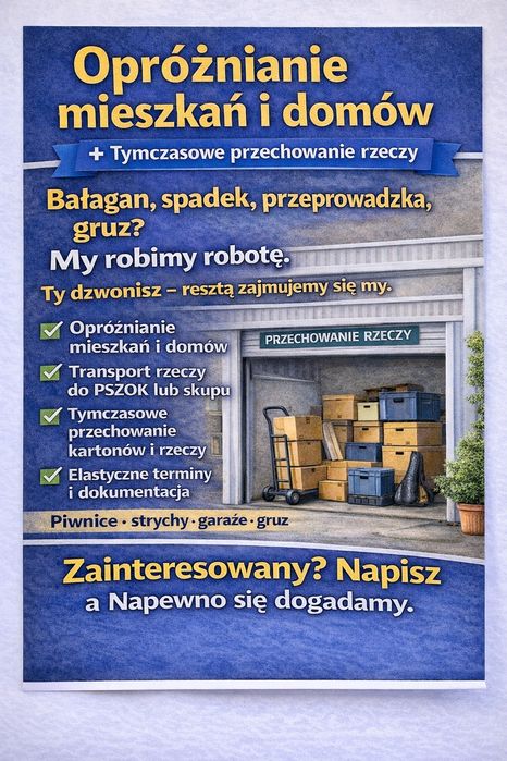 Skorzystaj z usługi opróżniania mieszkań w miejscowości Ciechanów i pozbądź się niepotrzebnych rzeczy. Znajdź profesjonalną pomoc na OLX Usługi!